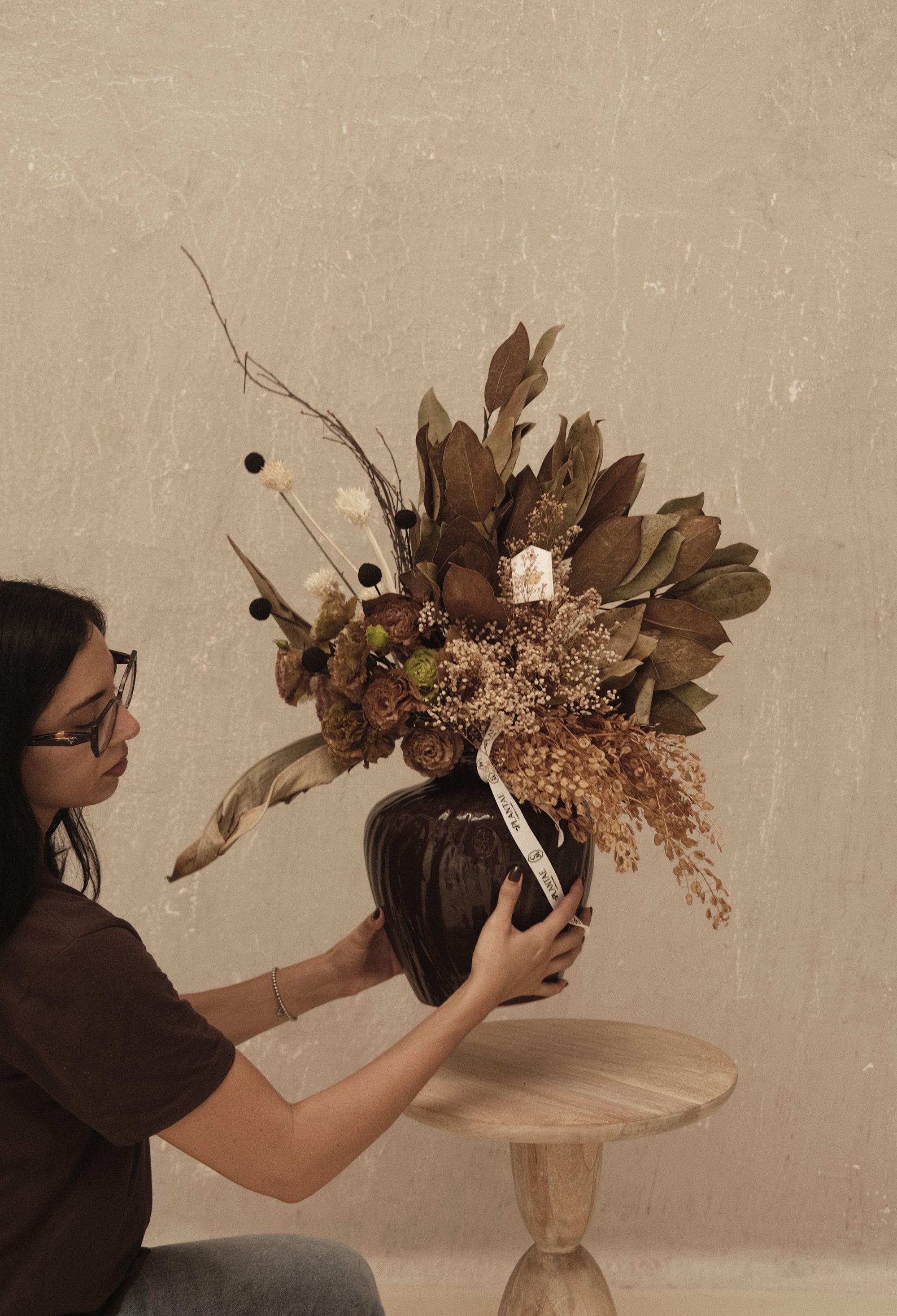 Cada pieza de cerámica fue pensada para realzar la fuerza y delicadeza de los arreglos florales de Nathalia. Al unir la cerámica y las flores, creamos un diálogo entre materiales que perduran y flores que transforman un instante en algo memorable.